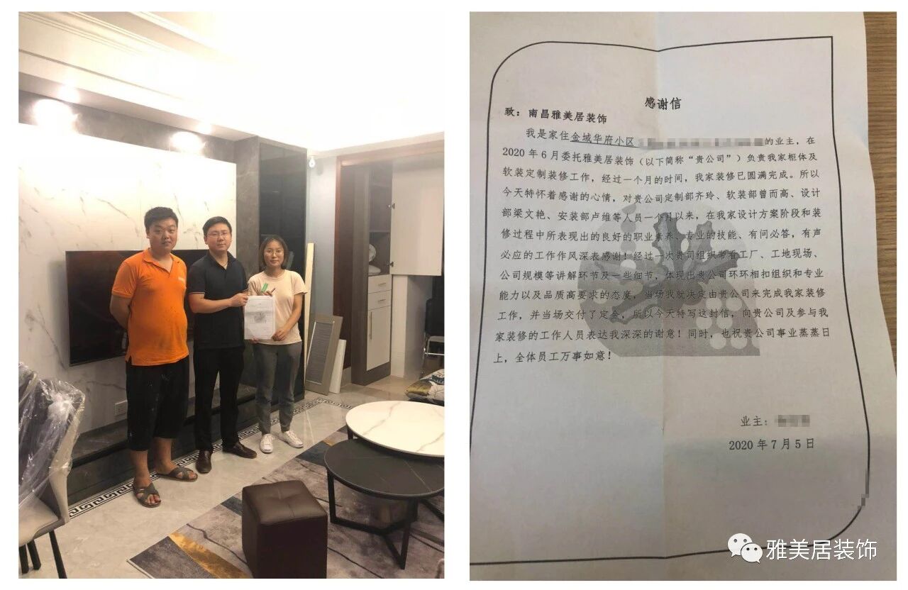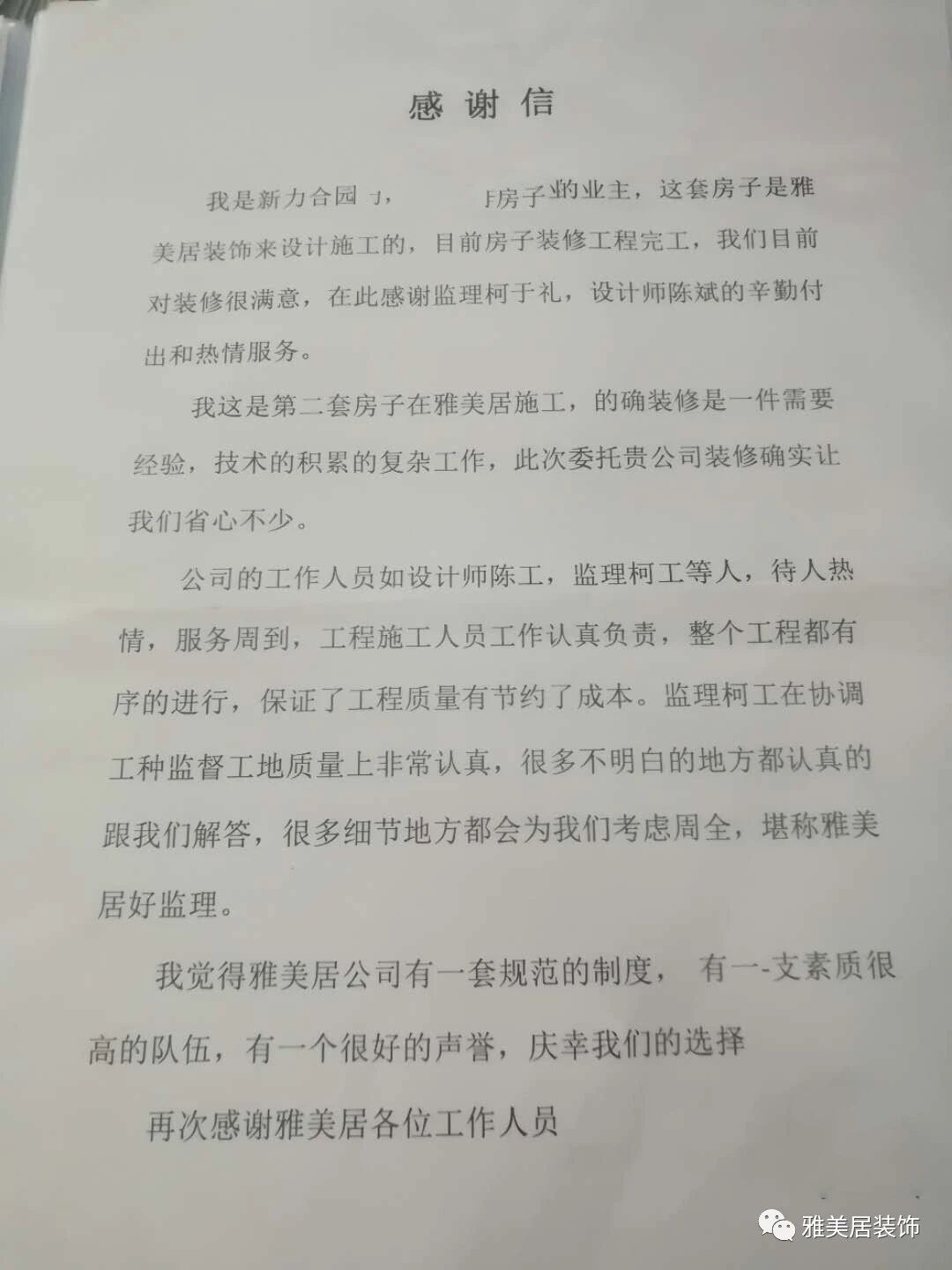 原来,去年八月份委托雅美居来负责家里的设计和施工,现在装修已经完工,特此书信一封对设计师李瑞煌、监理马说军,整装部梁文艳及主材部聂丹丹在施工期间的付出表示感谢。