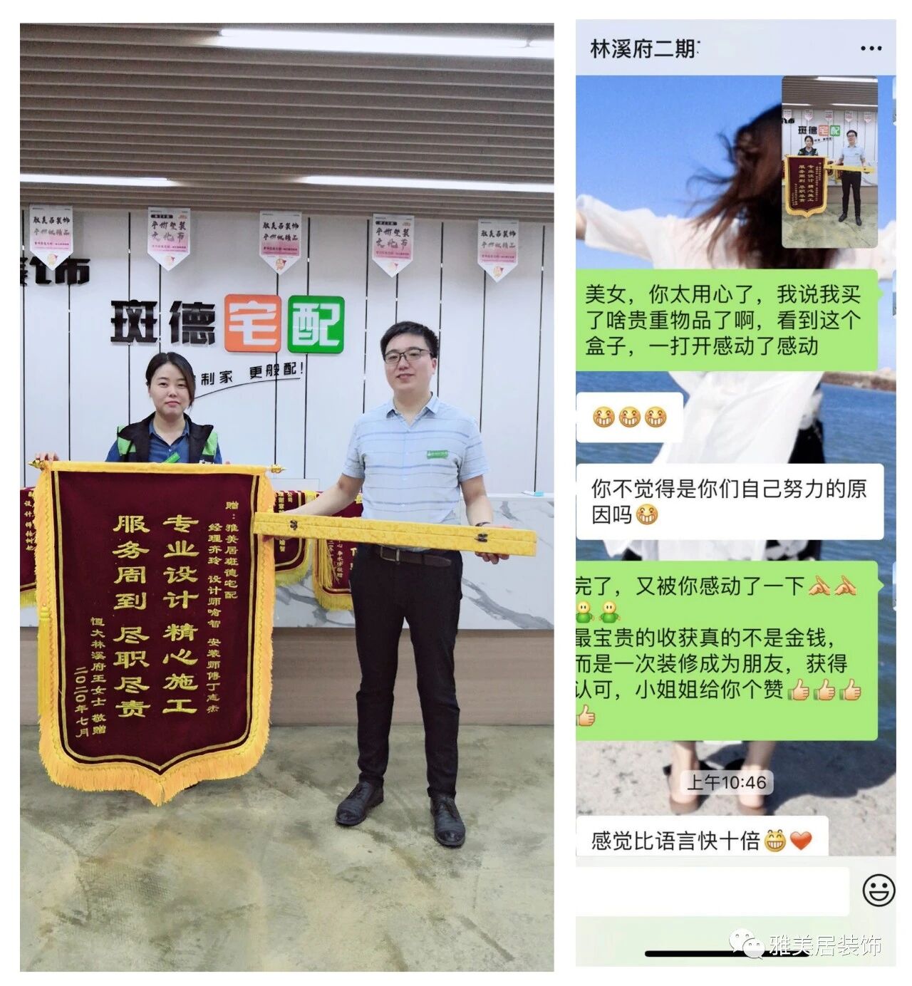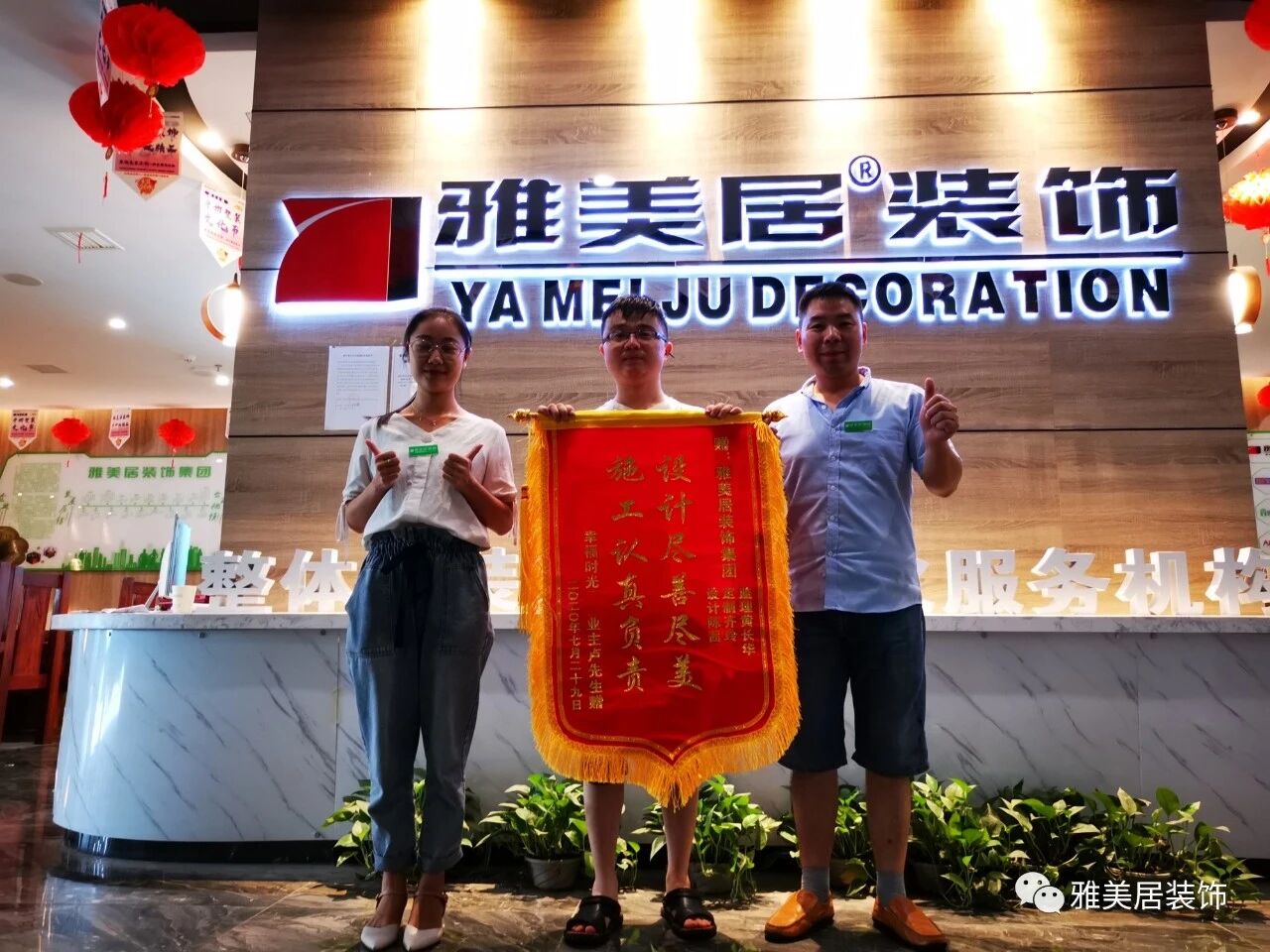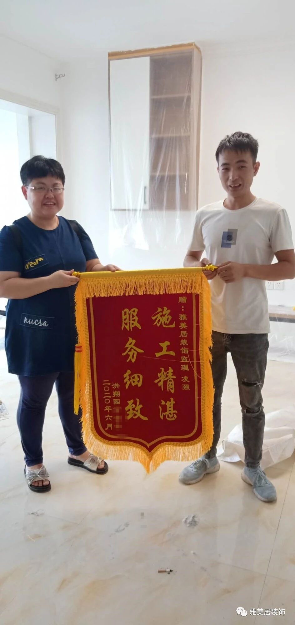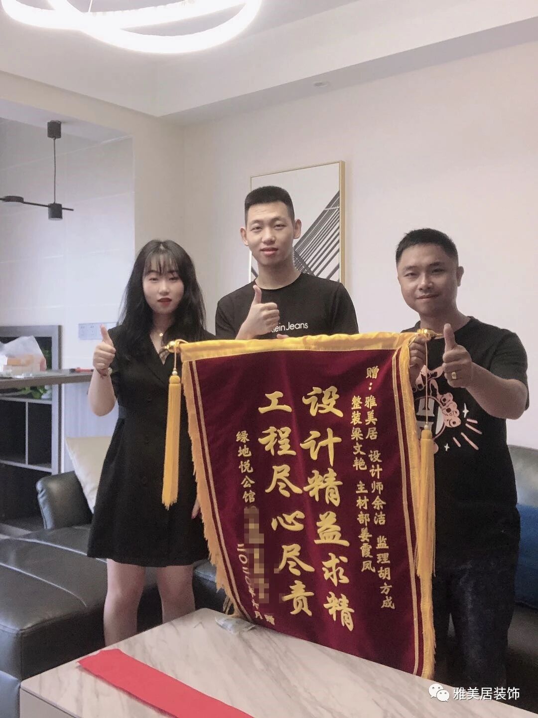 7月13日,家住绿地公馆的业主已装修完工,现场给设计师余洁、监理胡方成、定制设计师梁文艳、主材部姜霞凤送上定制锦旗“设计精益求精,工程尽心尽责”,表示对新居装修的满意。